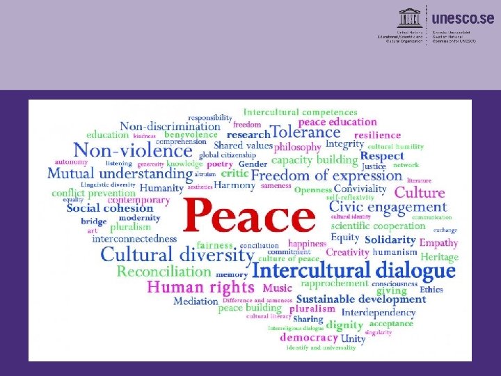 Unesco ”Eftersom krig börjar i människors sinnen, är det i människors sinnen som freden måste byggas” • Grundades 1945 • Sverige anslöt sig 1951 • 195 medlemsländer