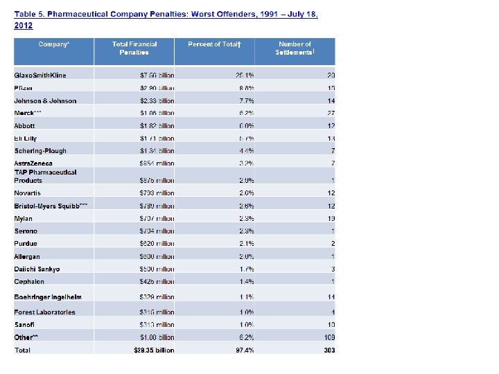 Increasing number of cases, increasing costs (1991 -2012) Number of settlements Financial penalties TOTAL (1991 -2012) 239 settlements, 30. 2 billion $ Source: Pharmaceutical Industry Criminal and Civil Penalties: An Update, Public Citizen, September 27, 2012 (2012 figures limited to first Semester!)