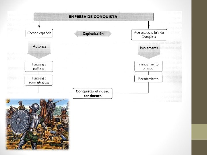 Visiones sobre el conquistador español DIEGO BARROS ARANA Los conquistadores manifestaban poca inclinación a establecerse definitivamente. Buscaban el medio para enriquecerse en pocos años para volver a España en una ventajosa posición de fortuna y ambicionaban, sobre todo, el tener reparticiones de indios a quienes hacer trabajar en los lavaderos de oro. FRANCISCO ANTONIO ENCINA Los españoles, con las armas a cuestas y combatiendo con la fatiga, el hambre, la sed, el rigor de la intemperie, tuvieron que abrirse paso por entre bosques primitivos e impenetrables y tuvieron que trepar las cordilleras más encumbradas, peleando a un tiempo con los enemigos, con los elementos y con el hambre. SERGIO VILLALOBOS El conquistador español fue un hombre de dos mundos: medioevo y renacimiento. Tuvo sed de gloria, deseos de dejar fama y memoria de sí. Pero también fue hombre de profundas convicciones religiosas. La conquista tuvo también fisonomía de cruzada. Fue un hombre audaz y mezcló en sus concepciones conceptos de la teología medieval e ideas capitalistas: arriesgó su hacienda por lo imprevisto, y aun cuando quiso salvar de la idolatría a los indios, cometió con ellos las mayores crueldades y tropelías.