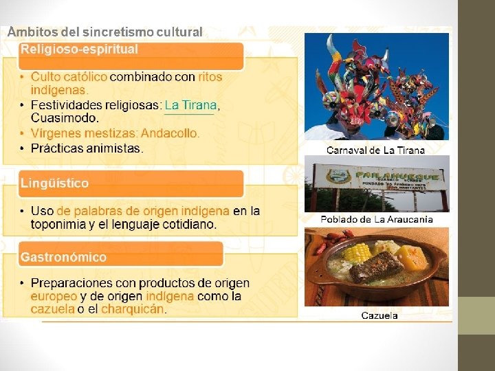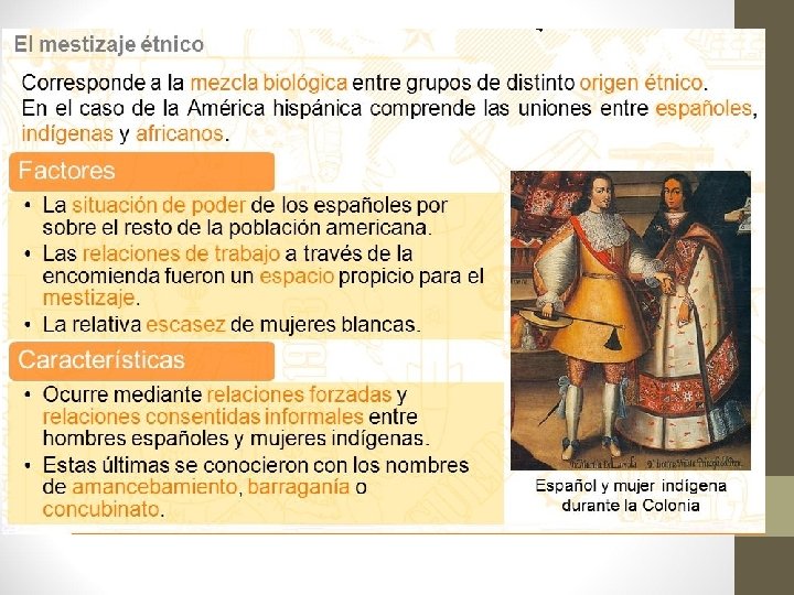 Conceptos Clave: COLONIA: Periodo durante el cual España tiene el dominio político, económico y cultural en América. MESTIZAJE: Proceso de mezcla biológica y cultural de diferentes etnias o razas. SINCRETISMO: Mezcla de diferentes expresiones culturales o religiosas. TRANSCULTURACIÓN: Adopción de un pueblo de formas culturales de otro sustituyendo parcial o completamente las formas propias.