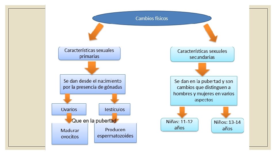 Desarrollo Físico • Transpiración con olor • Aparecen la cintura y las caderas • Vello en pubis y axilas • Crecimiento de mamas • Crecimiento y maduración de • la función de los ovarios y útero. • • • Transpiración con olor Ensanchamiento de tórax Vello en pubis y axilas Cambio de voz Crecimiento del pene Crecimiento y maduración de la función de los testículos.