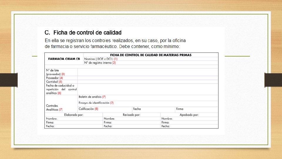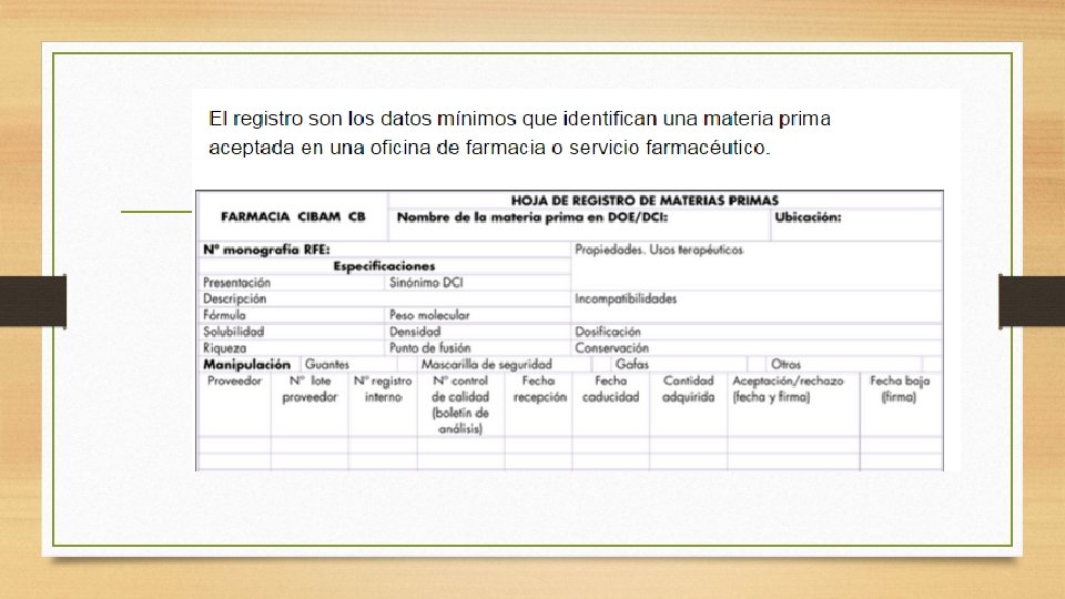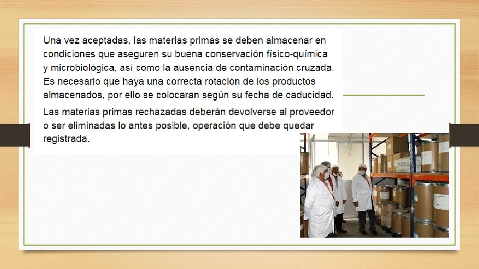 Proceso de uso de materia prima • 1. Recepción y documentación de la materia prima: Para llevar un control de la materia prima que se adquiere, ésta es registrada en hojas de control de inventarios. Adjudicándole códigos internos • 2. Revisión de la materia prima: El proceso comienza con la recepción de la materia prima, para garantizar que la materia prima que se recibe contiene las características propias de cada sustancia en comparación con las solicitadas a través de una orden de compra emitida al proveedor. Se realiza el análisis de las sustancias recibidas. En caso de no reunir dichas características, la materia prima es devuelta. Manteniendo en área de cuarentena rotulación amarilla.