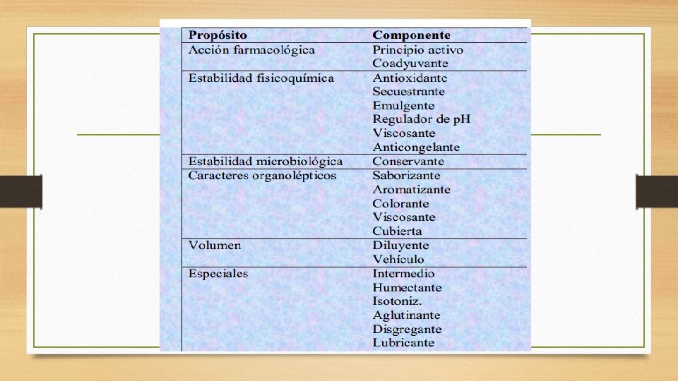 Tensoactivos: o surfactantes, son sustancia que presentan actividad de reducir la tensión de superficie del liquido en el que esta disuelto o quiere disolver otra sustancia Vehículo: es el componente de formas farmacéuticas líquidas que transporta a los demás y facilita la administración. Emulgentes: Favorece la estabilidad de fases inmiscibles en las emulsiones Regulador de p. H: para mejorar la estabilidad o la acción farmacológica o para adecuar el p. H del medicamento al fisiológico. Agregando un ácido o una base o utilizando una mezcla tampón.
