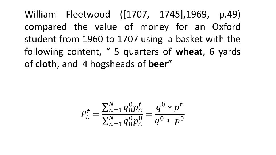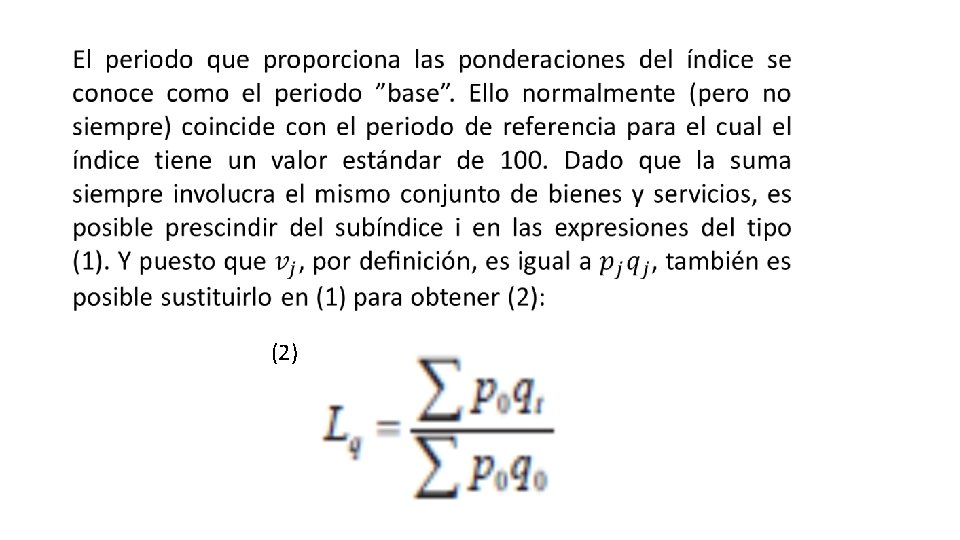 En particular, el producto de un índice de volumen de Laspeyres y el correspondiente índice de precios de Paasche es igual a la variación en valor de los bienes y servicios a precios corrientes entre el período 0 y el período t, es decir: (4)
