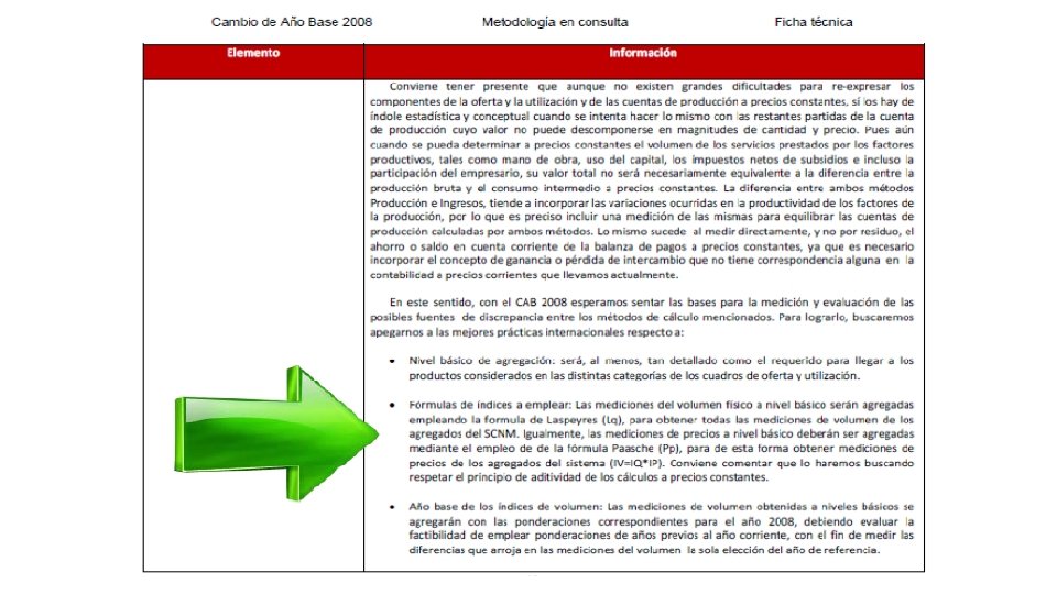 SCNM pp. 60 -1. “Dependiendo de la disponibilidad y detalle de la información, los cálculos a precios constantes pueden realizarse de dos formas: La primera, aplicada principalmente en actividades o transacciones con bienes tangibles, en la cual se valoran anualmente las cantidades de los distintos productos contenidos en la producción, el consumo, la inversión y el comercio exterior, a los precios que se registraron en un año determinado, al que se denomina año base. Una segunda forma de obtener resultados idénticos a los mencionados en la primera, es deflactando las partidas expresadas en valores corrientes con índices de precios apropiados; es decir, que tengan una estrecha relación con las partidas (por la cesta de bienes y servicios elegida para conformarlo). . . Una opción a estos dos métodos de cálculo, la cual se aplica en casos particulares en los que los agregados no pueden descomponerse en elementos de cantidad y precio, se refiere a la deflación de los flujos monetarios por medio de índices de precios que reflejan la cesta de bienes y servicios que pueden adquirirse mediante esos flujos. Sin embargo, debe tenerse presente que el resultado de deflactar cada agregado económico con índices de precios que sean distintos a los de los dos métodos anteriores, sólo proporcionará una medida de la capacidad adquisitiva del agregado, en términos “reales” y no necesariamente su expresión a precios constantes. “