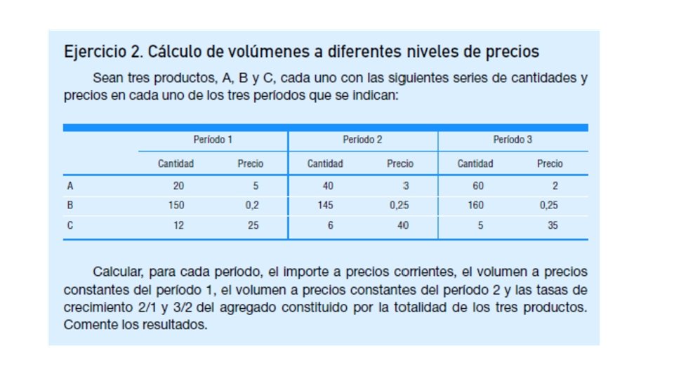 Llegados a este punto es necesario realizar una amplia digresión para explicar las nociones de índice de volumen e índice de precios para que el lector pueda comprender cómo se miden los volúmenes en las cuentas nacionales. Un índice de volumen es una media ponderada de las variaciones entre dos períodos de las cantidades de un determinado grupo de bienes y servicios.