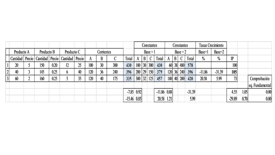 Algebraicamente, las expresiones (1) y (2) son idénticas, de donde se deduce que la variación en volumen a precios constantes se puede calcular de dos formas, de cuya aplicación se obtiene el mismo resultado: o como media de las variaciones en cantidad de varios productos ponderada por el valor a precios corrientes en el año base, dividida por el valor a precios corrientes en el año base; o como el importe de las cantidades en el período t multiplicado por los precios en el año base dividido por el valor a precios corrientes en el año base.
