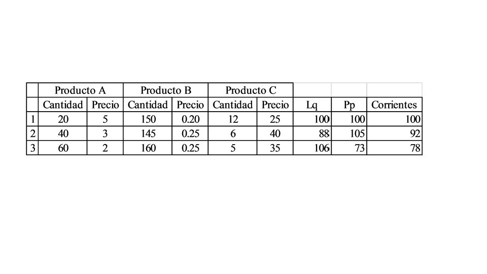 Para calcular la variación en volumen aplicando la fórmula que figura en el párrafo anterior resulta que hay que dividir la expresión (80 x 2) + (20 x 1), que es el volumen de automóviles producidos el segundo año, entre (50 x 2) + (50 x 1), que es el volumen de automóviles producidos el primer año.