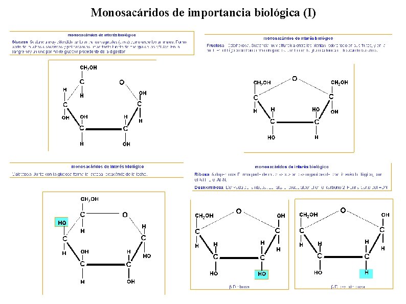 BLOQUE I ORIENTACIONES – 5 (cont. ) Clasificar los monosacáridos en función del número de átomos de carbono. Reconocer y escribir las fórmulas desarrolladas de los siguientes monosacáridos: Glucosa, fructosa y ribosa. Destacar la importancia biológica de los monosacáridos. Pentosas Las más importantes son: Ribosa: Es un componente estructural de nucleótidos en estado libre, como el ATP( adenosintrifosfato); y de ácidos nucleicos, como el ácido ribonucleico( ARN). Xilosa: Es el componente del polisacárido xilana, presente en la madera. Arabinosa: Es uno de los pocos monosacáridos que en la naturaleza se presenta en forma de L. Se encuentra en forma de goma arábica. Ribulosa: Actúa como intermediario activo en la fijación del dióxido de carbono atmosférico en los organismos autótrofos. Al ser una cetopentosa, no presenta estructura cíclica. Hexosas Las más comunes son: Glucosa: También llamada azúcar de la uva. Es el principal nutriente de los seres vivos que, mediente la respiración celular, es degradado parcial o totalmente para obtenergía. Se encuentra libre en el citoplasma celular, en los frutos y en la sangre. Además, es el constituyente de los polisacáridos más comunes, almidón y celulosa, en vegetales, y glucógeno en animales Galactosa: No se encuentra libre, forma parte de la lactosa( disacárido de la leche), de polisacáridos complejos y de heterósidos. Manosa: Es un componente de polisacáridos presentes en vegetales, bacterias, levaduras y hongos. Forma parte de la estreptomicina; sustancia con atividad antibiótica. Fructosa: Se encuentra en las frutas, libre o unida a la glucosa, formando el disacárido sacarosa. Actúa en el líquido seminal como nutriente de los espermatozoides. Las células hepáticas la transforman en glucosa, por lo que tiene un valor nutriente equivalente. Se denomina también levulosa, por ser una molécula fuertemente levógira.