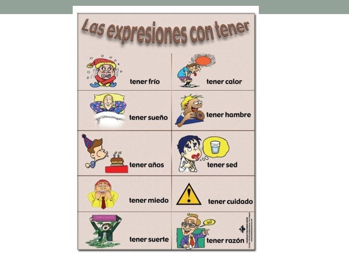 Gramatica Tener expressions • Can you list “tener” expressions we’ve learned so far? • Tener hambre • Tener sed • Tener ganas de • Tener años • Here a few more “tener” expressions • Tener calor • Tener frío • Tener razón • Tener suerte • Tener sueño • Tener miedo • Tener cuidado