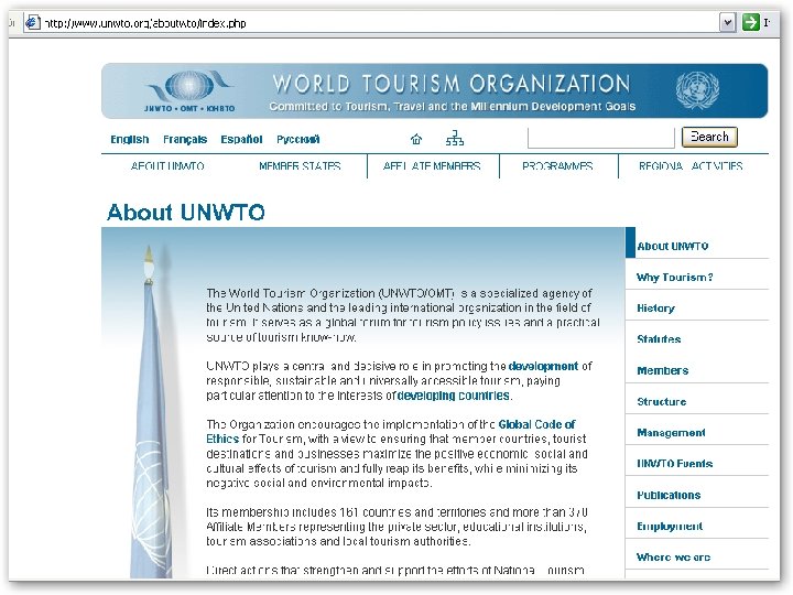 MINISTERIO DE TURISMO DE LA NACION Objetivos • Entender en todo lo relativo a la promoción y desarrollo en el país de la actividad turística interna y del turismo internacional receptivo, en todas sus formas y entender, en forma conjunta, con la Secretaría de Transporte del Ministerio de Planificación Federal, Inversión Pública y Servicios en la elaboración, ejecución y coordinación de la política nacional de navegación aerocomercial, exclusivamente relacionada al área del Turismo. • Entender en la preservación y administración de los bosques, parques y reservas nacionales, áreas protegidas y monumentos naturales. • Supervisar el accionar de la Administración de Parques Nacionales.