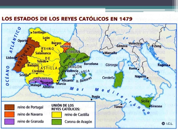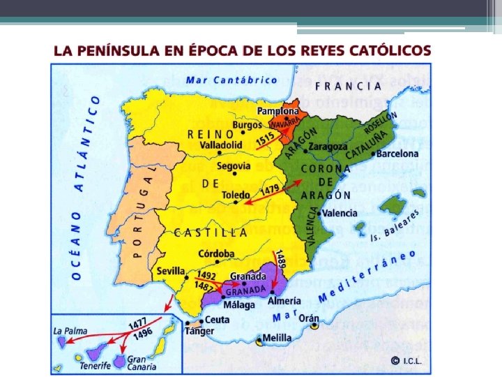 La monarquía de los Reyes Católicos 2. La expansión territorial: • Los Reyes Católicos pretendieron unir todos los territorios peninsulares bajo su corona. Para ello llevaron a cabo una ambiciosa política de expansión territorial: § La conquista del reino musulmán de Granada, tras una guerra que se prolongó durante 10 años (1482 -1479). Significó la caída del último reducto musulmán en la Península. § La anexión del reino de Navarra, que se había aliado con el rey de Francia, fue invadido por un ejército castellano en 1512 e incorporado a Castilla en 1515. § Los Reyes Católicos desarrollaron una política de enlaces matrimoniales con Portugal, casando sucesivamente a dos de sus hijas, Isabel y María, con el rey de Portugal. Estos enlaces dieron fruto años más tarde, cuando Felipe II heredó el reino de Portugal y lo incorporó a la Corona. § La incorporación de las islas Canarias a la Corona de Castilla. § Descubrimiento y posterir colonización de América
