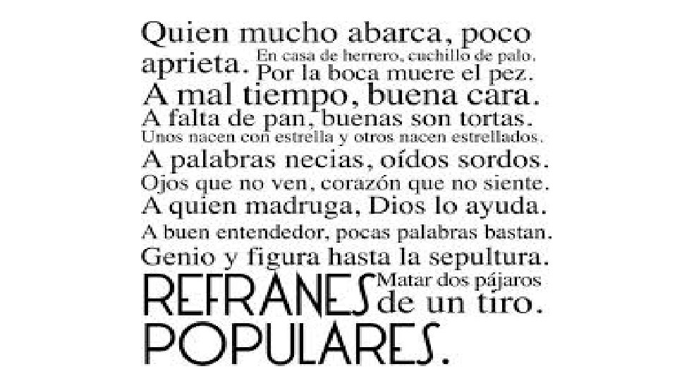 Vocabulario: frases hechas. • Pasar la noche en blanco/ en vela, no pegar ojo, estar como un búho = No dormir. • Ni chicha ni limoná = Ni una cosa ni otra. En medio de nada. • Las paredes oyen; Hay ropa tendida = Hay cosas que no se deben decir porque las puede oír alguien que no deba. • A ojo de buen cubero = Calibrar más o menos. (Antiguamente la madera se cubicaba y el maderero Lo hacía a ojo). • No hay tutía = Que un problema no tiene solución ( Procede de la planta medicinal). • Echarle a uno los perros = echarle la culpa de algo. Meterse con alguien. • En tiempo de vacas gordas = Cuando las cosas van bien (procede de la interpretación de José al faraón).