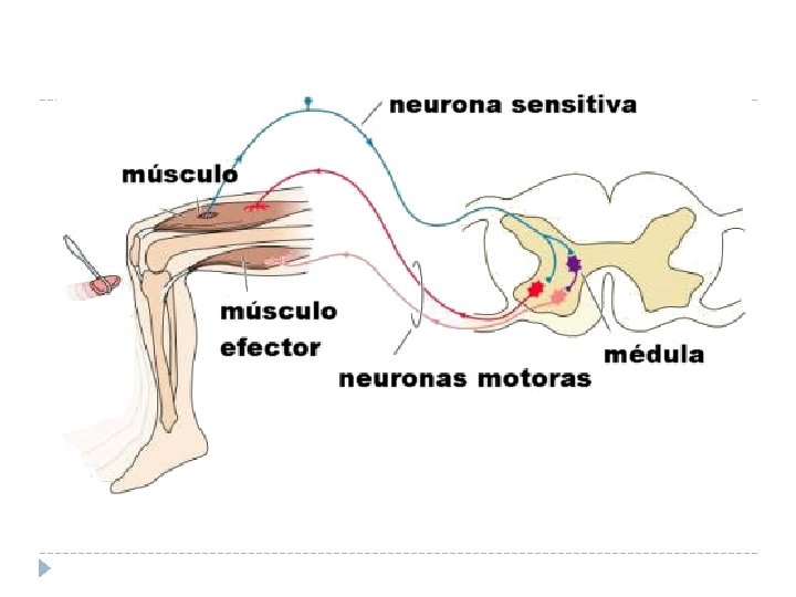 REFLEJOS – Respuesta innata, automática e involuntaria que se produce como reacción a estímulos específicos. • Estornudos, contracción pupila, succión, salivar, asustarse, flexionar una pierna por un golpe, … – Las RR reflejas suelen ser motoras. – Estructura fisiológica del ARCO REFLEJO: • Receptor sensorial: capta los estímulos ambientales. • Neurona aferente: conduce el impulso hasta médula o el cerebro. • Neurona eferente: transporta el impulso desde el centro nervioso hasta el órgano encargado de la respuesta. • Efector: músculo o glándula que ejecuta la respuesta.
