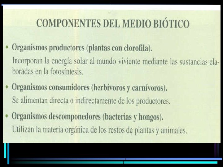 Biocenosis o lo biótico Autótrofos (Productores) Fotosíntéticos Quimiosintéticos Consumidores Primarios ( Herbívoros) Heterótrofos Consumidores secundarios ( Consumidores) Consumidores terciarios Consumidores de cuarto orden