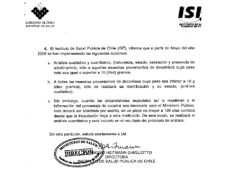 Modificación Art 43 Propuesta por el Ministerio Público Artículo 43. Inciso 1º: “Los Servicios de Salud, los Laboratorios de Criminalística de Carabineros y la Policía de Investigaciones de Chile, y laboratorios nacionales o extranjeros debidamente acreditados ante el Ministerio Público, remitirán, a solicitud del Fiscal, en el más breve plazo, un protocolo de análisis químico de la sustancia suministrada en el que se identificará el producto y se señalará su peso o cantidad, su naturaleza, contenido, composición, como, asimismo, un informe acerca de los componentes tóxicos y sicoactivos asociados, los efectos que produzca y la peligrosidad que revista para la salud pública. Este informe sólo estará destinado al cumplimiento de fines administrativos y de registro de las especies que hayan sido incautadas en diligencias de investigación. El grado de pureza en nada afectará la identificación de la sustancia como una de aquellas incluidas en el reglamento de esta ley. Inciso 2º: “El correspondiente Servicio o laboratorio conservará, en todo caso, una determinada cantidad de dicha sustancia para el evento de que cualquiera de los intervinientes solicite nuevos análisis de la misma, de conformidad a los artículos 188, inciso tercero, y 320 del Código Procesal Penal. La prueba de los delitos sancionados en esta ley se rige por las normas generales, respetando el principio de libertad probatoria consagrado en el artículo 295 del Código Procesal Penal. Inciso 4: Efectuado el análisis a que se refiere el inciso primero, los precursores y sustancias químicas esenciales solo podrán ser enajenados en la forma dispuesta en el inciso cuarto del artículo 40 cuando, por su cantidad o naturaleza, pueda estimarse que se destinarán a un uso lícito. En caso contrario, deberá procederse a su destrucción, previa autorización del Juez de Garantía.