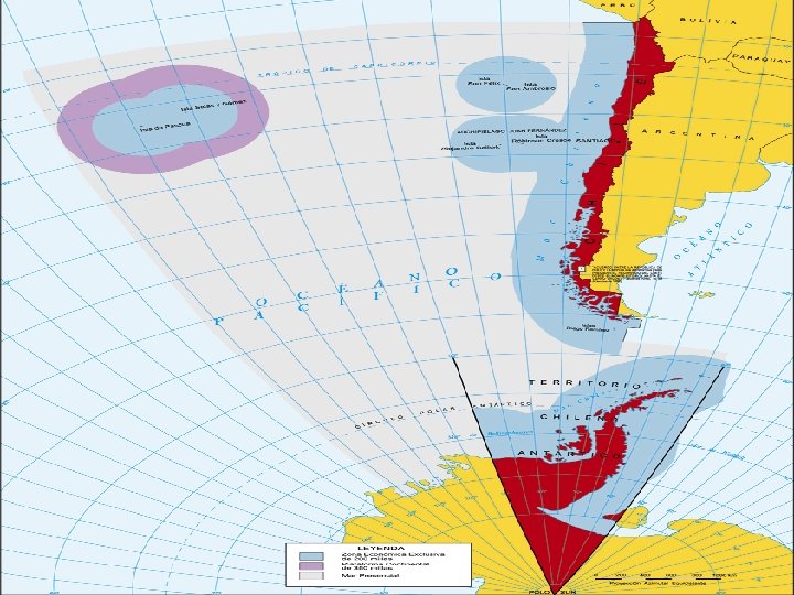 § Zona Económica Exclusiva: franja de 200 millas sobre las que le Estado tiene el derecho a explotar, explorar, conservar y administrar todos los recursos naturales vivos y no vivos. § Mar Presencial: área de altamar comprendida entre los 200 millas y el meridiano del borde occidental de la Plataforma Continental de la I. de Pascua (350 millas), presencia en actividades científicas y económicas.