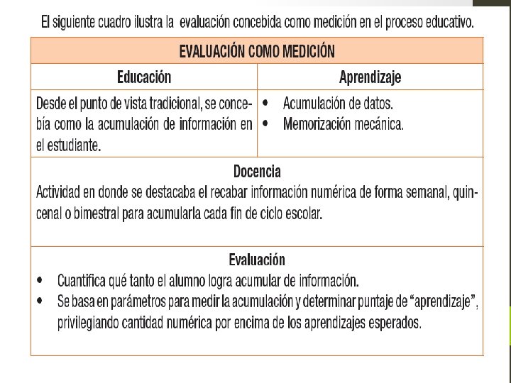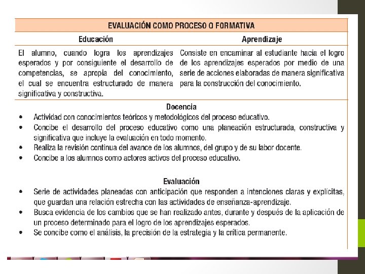 ENTONCES ¿QUÉ ESEVALUACIÓN EN NUESTROS DÍAS El Plan de estudios 2011 para la Educación Básica recupera las aportaciones de la evaluación educativa y define la evaluación de los aprendizajes de los alumnos como “el proceso que permite obtener evidencias, elaborar juicios y brindar retroalimentación sobre los logros de aprendizaje de los alumnos a lo largo de su formación; por tanto, es parte constitutiva de la enseñanza y del aprendizaje” (SEP, 2011: 22). Este enfoque formativo enriquece las aportaciones de la evaluación educativa al indicar que el centro de la evaluación son los aprendizajes y no los alumnos, esto es, se evalúa el desempeño y no la persona; con ello, la evaluación deja de ser una medida de sanción. En la comprensión del enfoque formativo de la evaluación que plantea el Plan de estudios 2011, es necesario considerar los siguientes aspectos: