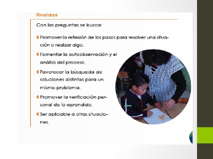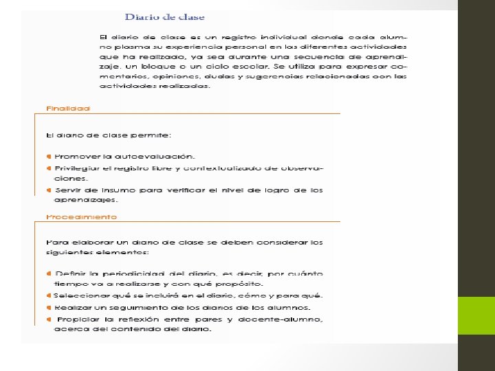 • Identificación de fortalezas y áreas de oportunidad en el aprendizaje de los alumnos (valorar el saber). • Detección de aciertos y destrezas de los alumnos para aplicar y fortalecer su aprendizaje constructivo y significativo (valorar el saber hacer). • Orientación o prescripción de maneras de acrecentar las fortalezas en conocimientos de los estudiantes (valorar el saber). • Elaboración de estrategias didácticas y actividades para apoyar y fortalecer el aprendizaje (valorar el saber hacer). • Promoción y puesta en práctica de una comunicación más fluida con los estudiantes (valorar el saber ser). • Fomento de una actitud y juicio crítico de forma responsable, ya sea individual o grupal (valorar el saber ser).