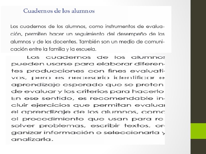 Al no aplicar adecuadamente las diferentes evaluaciones, se puede detener el proceso de aprendizaje de varias maneras; por ejemplo: • Si los exámenes y las tareas que se evalúan no comunican lo que es importante aprender o no se enfocan en los aprendizajes esperados, los alumnos no podrán mejorar sus aprendizajes. • La asignación de calificaciones como premio o castigo puede terminar con la motivación de los alumnos por aprender. • Si los alumnos perciben la obtención de una calificación como un logro fuera de su alcance, puede aminorar su esfuerzo y aumentar los distractores en el aprendizaje. • Las prácticas de evaluación en las que se aplican pre-mios o castigos pueden reducir la colaboración entre los alumnos o la motivación por aprender de los demás.