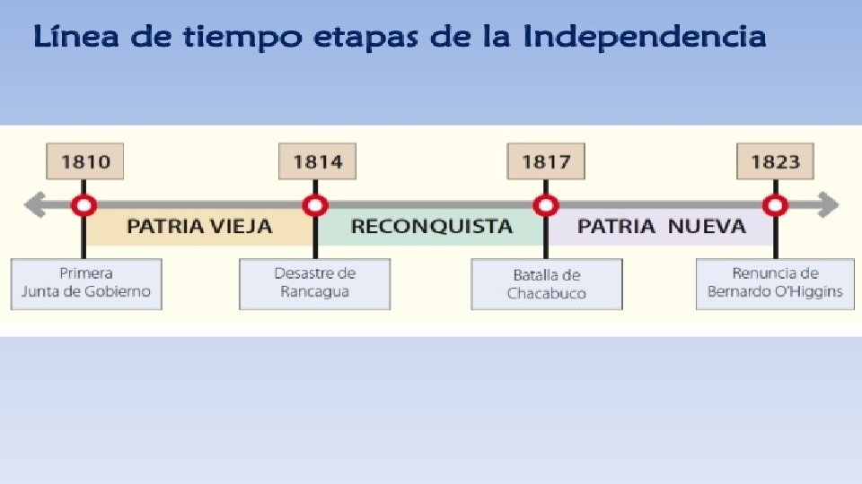 La Independencia de Chile • El proceso de independencia de Chile abarca el periodo comprendido la primera junta de gobierno de 1810 y la renuncia de O'Higgins en 1823. • Dentro de la independencia podemos distinguir 3 etapas marcadas por diferentes hechos