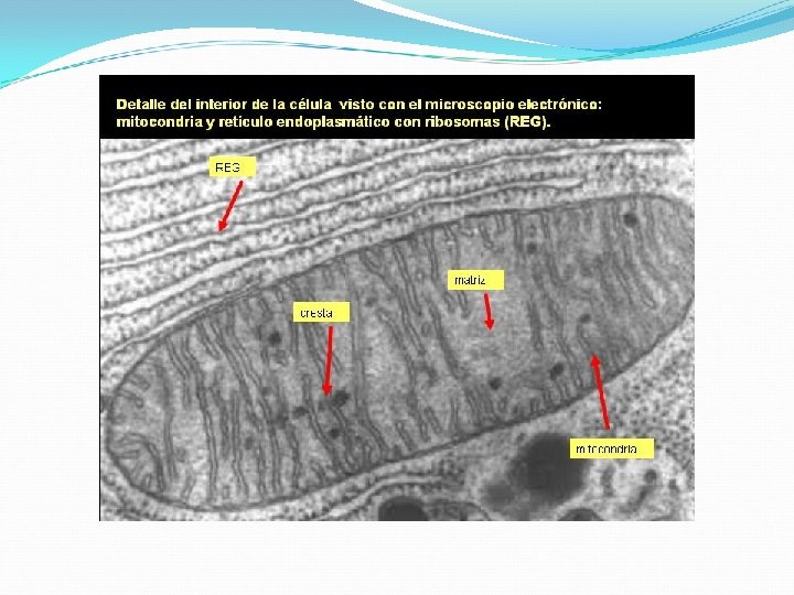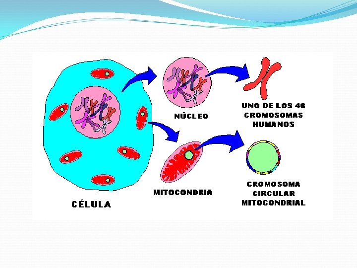 v Las mitocondrias constan de una membrana externa y una membrana interna que se pliega formando crestas. v En la cresta mitocondrial se encuentran los citocromos, donde ocurre la cadena de transporte de electrones, que permiten la generación de moléculas de ATP. v En la matríz mitocondrial se encuentra libre una molécula de ADN mitocondrial