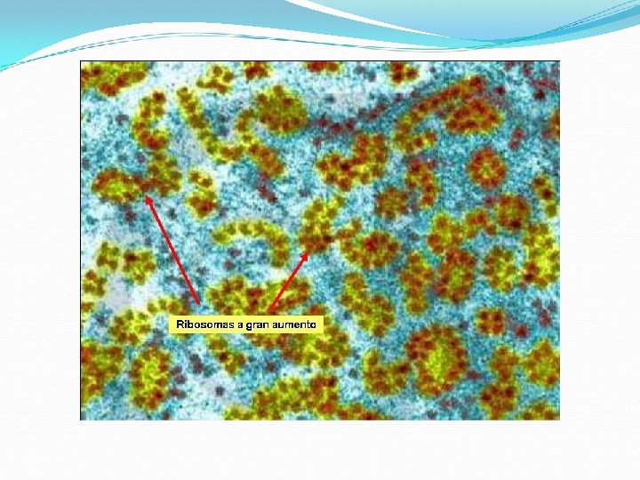 Los ribosomas son responsables del aspecto granuloso del citoplasma de las células. Es el orgánulo más abundante, varios millones por célula. Posee una subunidad mayor y otra menor, donde se encuentran los sitios P y A, lugar de “lectura” del ARNm y acoplamiento de los aminoácidos que formarán la proteína.
