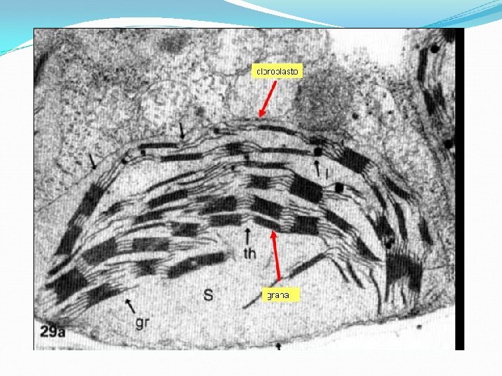 CLOROPLASTOS Presentan una matríz –que contiene una molécula de ADN- y tilakoides, los que poseen los pigmentos de clorofila. El conjunto de tilakoides se denomina grana, y éstas se encuentran unidas a través de intergranas. En la matríz ocurre la fase oscura de la fotosíntesis y en el tilakoides la fase clara.