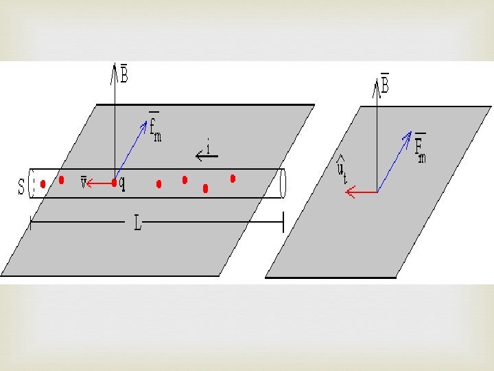 Fuerza magnética sobre un conductor que conduce una corriente Para un conductor que conduce una corriente y se coloca en un campo magnético uniforme, la fuerza magnética se expresa por; F = I. L(u X B) Donde: I = la intensidad de corriente, L = longitud del conductor, u = vector unitario en la dirección de la corriente, B = densidad de flujo magnético, X indicador de producto vectorial.