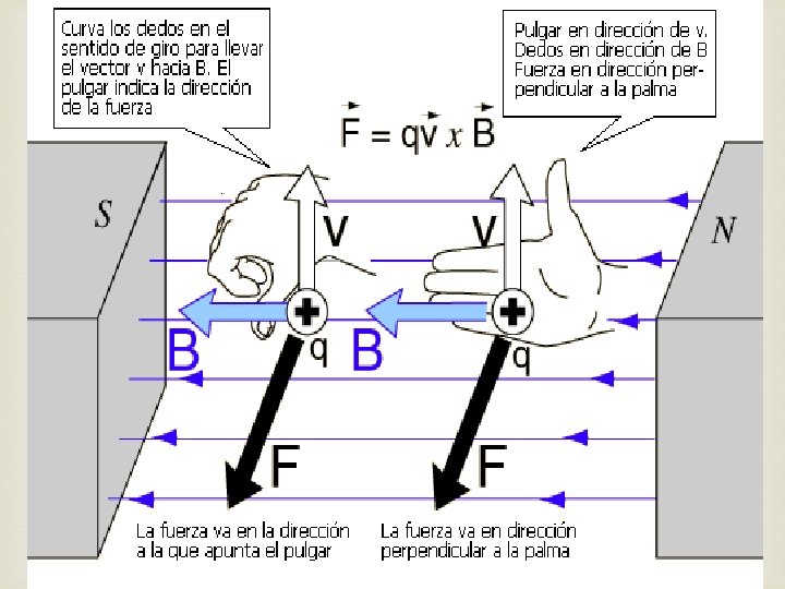 Resultados experimentales Experimentalmente se encuentra que la fuerza magnética presenta las siguientes características: Su dirección es perpendicular al plano determinado por la velocidad de la carga y la dirección del campo magnético. Su sentido se obtiene mediante la regla de la mano derecha en el caso de cargas positivas (el sentido es opuesto para cargas negativas). Su magnitud es cero cuando la velocidad de la carga y el campo magnético son paralelos y es máxima cuando la velocidad y el campo eléctrico son perpendiculares.
