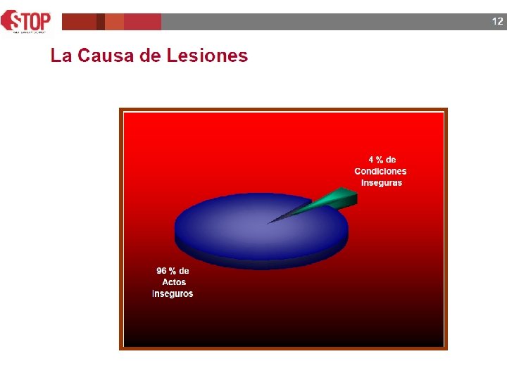 Prácticas de trabajo inseguras causa de lesiones con días de trabajo perdido y labores restringidas ESTUDIO DE 10 AÑOS EQUIPO DE PROTECCION PERSONAL POSICIONES DE LAS PERSONAS REACCIONES DE LAS PERSONAS HERRAMIENTAS EQUIPOS PROCEDIMIENTOS ORDEN Y LIMPIEZA TOTAL PROVOCADO POR CONDUCTAS INSEGURAS DURANTE EL TRABAJO OTRAS CAUSAS COMO LA NATURALEZA Y CONDICIONES INSEGURAS CREADAS Y/O PERMITIDAS TOTAL 12 % 30 % 14 % 20 % 8% 11 % 1% 96 % 4% 100 %