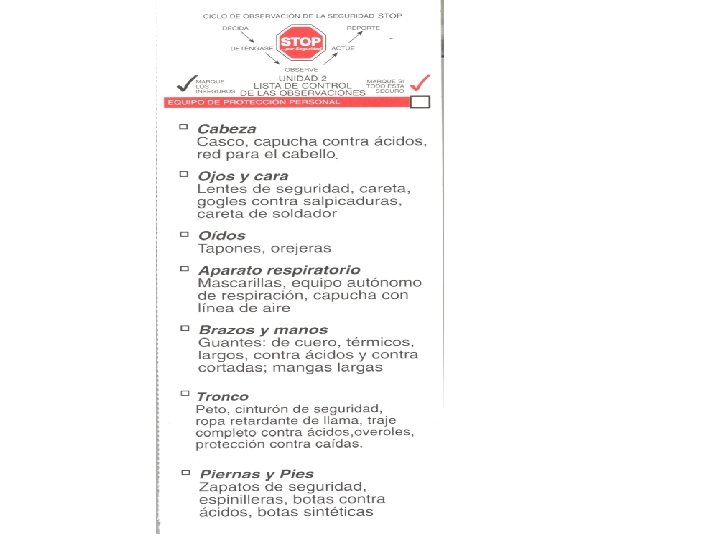 EQUIPO DE PROTECCION PERSONAL CICLO DE LA SEGURIDAD DEL PROGRAMA STOP. ACTUE DECIDA Por Seguridad DETENGASE PIENSE OBSERVE