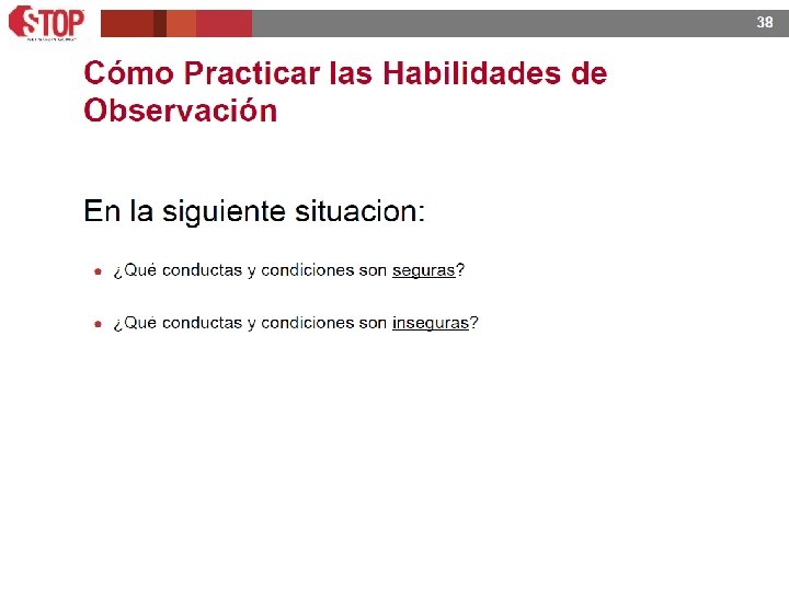 DECIDA: Otorge máxima prioridad a la seguridad. DETENGASE: Preste toda su atención al área de trabajo. OBSERVE: Busque actos inseguros y condiciones inseguras. Recurra a la AUTO-OBSERVACION y a su “visión mental” para: - Pensar como hacia el trabajo en el pasado. - Pensar como lo esta haciendo ahora y como planea hacerlo. - Comparar estas dos ideas con la forma en que deberia realizar el trabajo con seguridad. -Ver ejemplos y comentarlos. Recurra a la OBSERVACION TOTAL y a sus sentidos para que: - MIRE Arriba, Abajo, Atras, Adentro (lo que llamamos las 4 A). Por Seguridad - ESCUCHE los ruidos no habituales. - HUELA los olores no habituales. - SIENTA las temperaturas y las vibraciones no habituales.