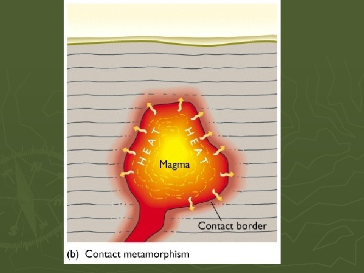 Tipos de Metamorfismo El metamorfismo de contacto: producido en salbandas o aureolas alrededor de cuerpos intrusivos en vías de enfriamiento. En estos casos T>>P permitiendo la recristalización y transformación de las rocas que están próximas al contacto