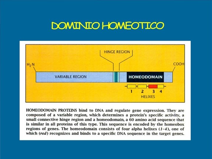 El homeobox fue descrito en 1983, como un fragmento de DNA de 180 pares de bases ordenadas en la forma de un motivo altamente conservado, esto es, una secuencia de nucleótidos en el DNA con una amplia distribución evolutiva, desde las levaduras pasando por las plantas, hasta el hombre. Esta secuencia de DNA codifica para un péptido de 60 aminoácidos de largo, denominado homeodominio que se ubica en el extremo amino terminal de la proteína. En diferentes genes con homeobox el homeodominio es similar pero no el mismo, de hecho la comparación de sus secuencias proporciona las bases para clasificar a estos genes. El homeodominio de 60 aminoácidos muestra una estructura de unión al DNA llamada hélice-vuelta hélice, la secuencia de unión al DNA ha sido descrita como 5'AAT 3'. El sitio de reconocimiento del DNA es la hélice 3, denominada hélice de reconocimiento, la que se ubica en el surco mayor de la doble hebra de DNA, proporcionando la mayoría de los puentes de hidrógeno que se forman con las bases del DNA.
