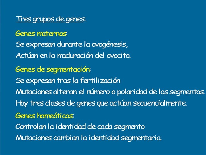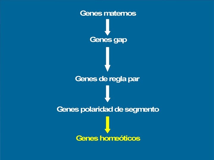 GENES QUE CONTROLAN EL DESARROLLO EMBRIONARIO. Genes que determinan el tipo de órgano, ubicados en cromosomas I, II (maternos, segmentación) Genes que determinan la posición de los órganos, ubicados en cromosomas III. (Homeóticos)