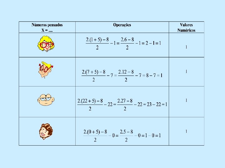 Início Pense em um número x Some 5 x+5 Calcule o dobro 2. ( x + 5 ) Retire 8 do resultado 2. (x+5)-8 Calcule a metade 2. (x+5)-8 2 Diminua o número que pensaste inicialmente O resultado é 1 2. (x+5)-8 2 FIM x