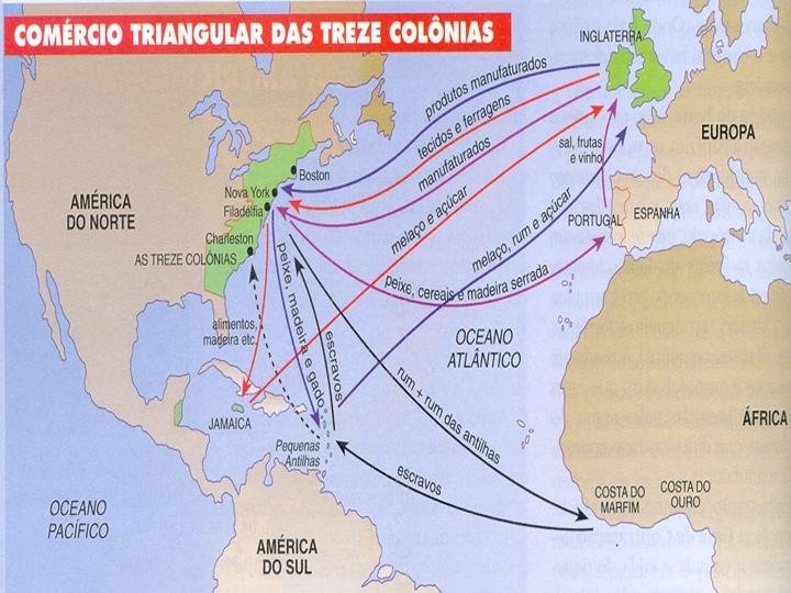COLÔNIAS DO NORTE E DO CENTRO ð COLÔNIAS DO NORTE: 1620 ð fundação da cidade de New Plymouth (Massachussets) pelos "peregrinos do Mayflower", puritanos que fugiram da Inglaterra ð novos núcleos foram surgindo, vinculados à atividade pesqueira, ao cultivo em pequenas propriedades e ao comércio. ð migração para outras regiões e fundação de novas colônias: Rhode Island e Connecticut (1636) e New Hampshire (1638) - "NOVA INGLATERRA“ ð CARACTERÍSTICAS - trabalho livre, assalariado ou servidão temporária - pequena propriedade policultora - produção manufatureira/comércio - sociedade: pequenos agricultores e ricos comerciantes - autonomia político-administrativa ð COLÔNIAS DO CENTRO: últimas a surgirem, 1660. ð ocupação da região ocorreu principalmente por refugiados religiosos ð pensamento liberal enraizou-se, tanto do ponto de vista político como religioso. ð Nova Iorque, Pensilvânia, Nova Jérsei e Delaware : agricultura em pequenas propriedades, criação de animais, com uma produção diversificada e estrutura semelhante à da Nova Inglaterra.