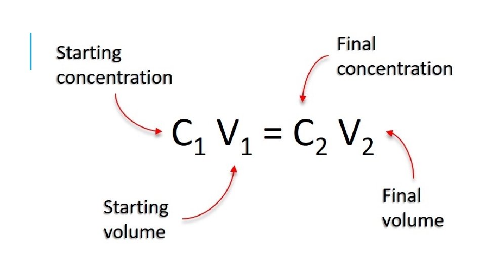 CALCULAR DILUCIONES §Utilizando conjuntos proporcionales; utilizadas para calcular un desconocido donde dos soluciones son mezclas proporcionales. §C 1 v 1 = concentración inicial y volumen inicial §C 2 V 2 = concentración final y volumen final