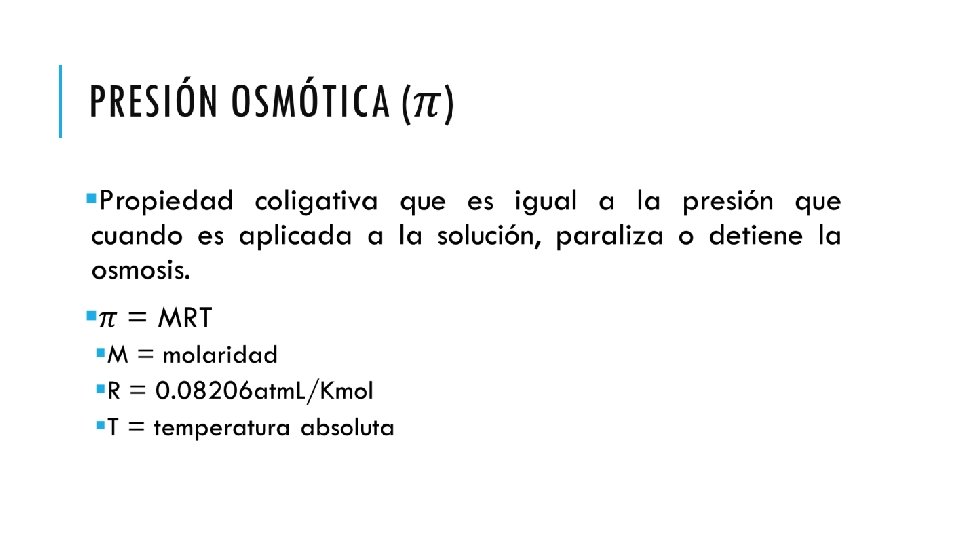 PRESIÓN OSMÓTICA §Osmosis –el flujo de solvente a través de una membrana semipermeable para igualar la concentración de soluto en ambos lados de la membrana. §Membrana semipermeable permite el flujo de solventes. –