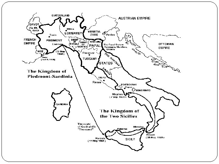 Garibaldi Unites Southern Italy �Giuseppe Garibaldi- 1860 - Red Shirtsleader of Italian Nationalists in the South united Italy but made a deal with Cavour so that Cavour would rule � 1866 Venetia added � 1870 papal states added
