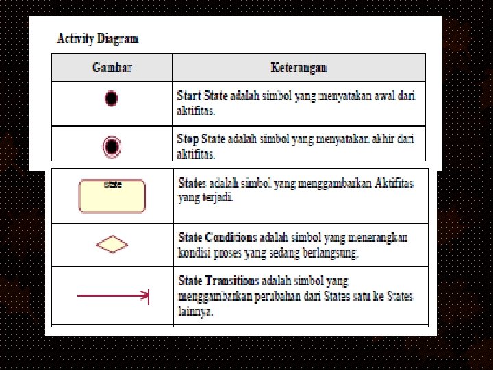2. Activity Diagram Definisi Diagram Aktivitas Yaitu Suatu diagram perilaku yang memodelkan suatu status mesin, yang fokus kepada urutan aktivitas satu ke aktivitas lainnya. Berikut gambar Simbol Activity Diagram
