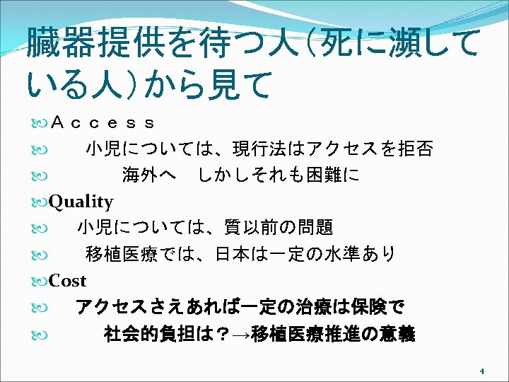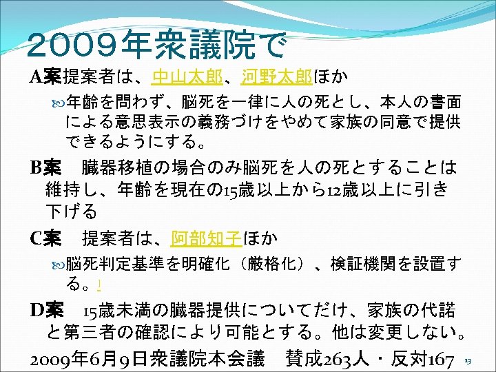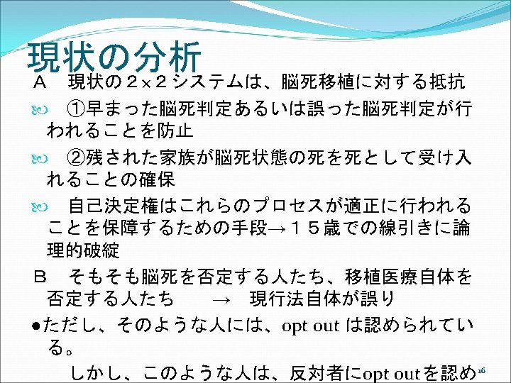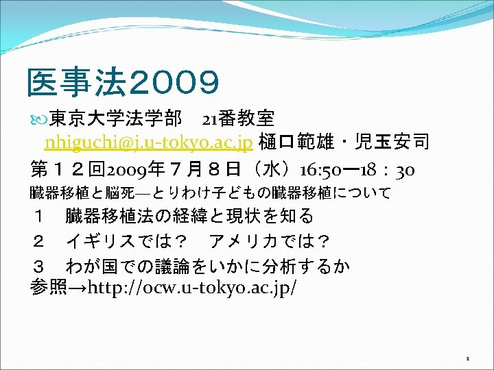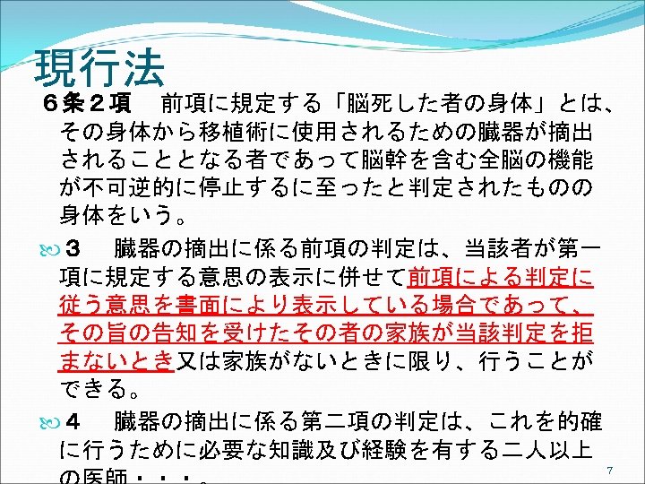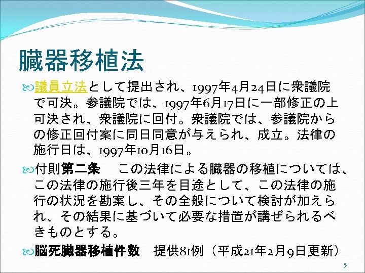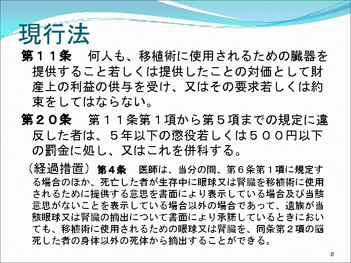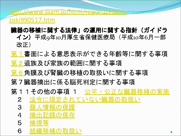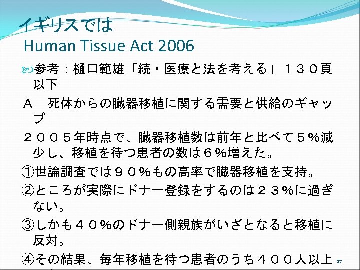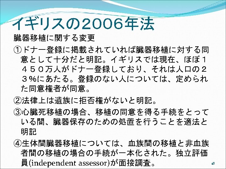 アメリカでは Uniform Anatomical Gift Act (UAGA) 2006 ①UAGA 1968, shortly after Dr. Christian Barnard’s successful transplant of a heart in November, 1967. Promptly and uniformly enacted in every jurisdiction. ②Only 26 states enacted the 1987 UAGA, resulting in non-uniformity. Subsequent changes in each state over the years have resulted in even less uniformity. ③ The 2006 UAGA is an effort to resolve any perceived inconsistencies thereby adding to the efficiency of the current system. 19