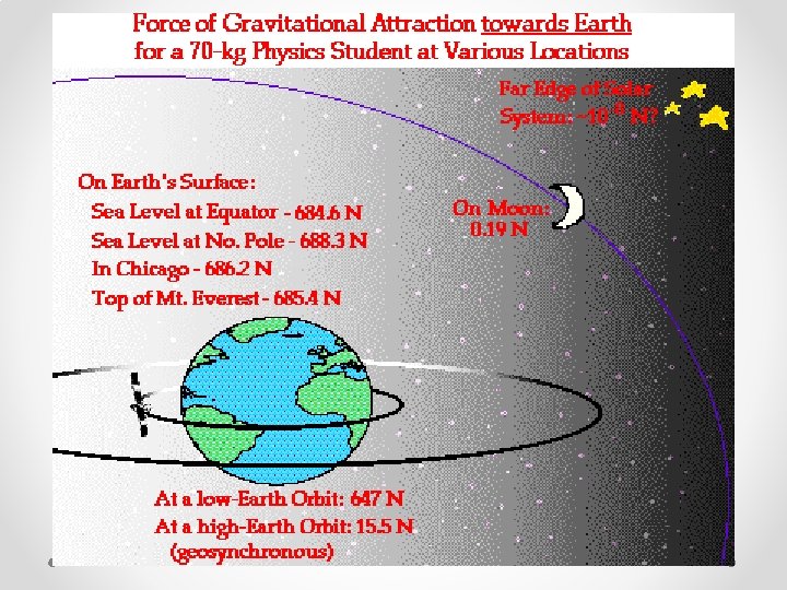 Determine the force of gravitational attraction between the earth (m = 5. 98 x 1024 kg) and a 70 -kg physics student if the student is standing at sea level, a distance of 6. 38 x 106 m from earth's center. Determine the force of gravitational attraction between the earth (m = 5. 98 x 1024 kg) and a 70 -kg physics student if the student is in an airplane at 40000 feet above earth's surface. This would place the student a distance of 6. 39 x 106 m from earth's center.