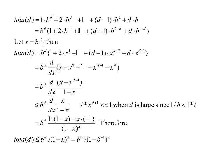 Depth-First Iterative Deepening • If branching factor is b and solution is at depth d, then nodes at depth d are generated once, nodes at depth d-1 are generated twice, etc. , and node at depth 1 is generated d times. Hence total(d) = b^d + 2 b^(d-1) +. . . + db <= b^d / (1 - 1/b)^2 = O(b^d). – If b=4, then worst case is 1. 78 * 4^d, I. e. , 78% more nodes searched than exist at depth d (in the worst case).