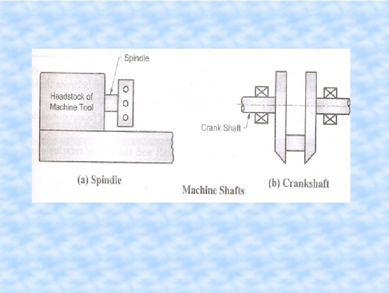 SHAFT In machinery, the general term “shaft” refers to a member, usually of circular cross-section, which supports gears, sprockets, wheels, rotors, etc. , and which is subjected to torsion and to transverse or axial loads acting singly or in combination. An “axle” is a non-rotating member that supports wheels, pulleys, … and carries no torque. A “spindle” is a short shaft. Terms such as line shaft, transmission shaft, counter shaft, and flexible shaft are names associated with special type of shafts.