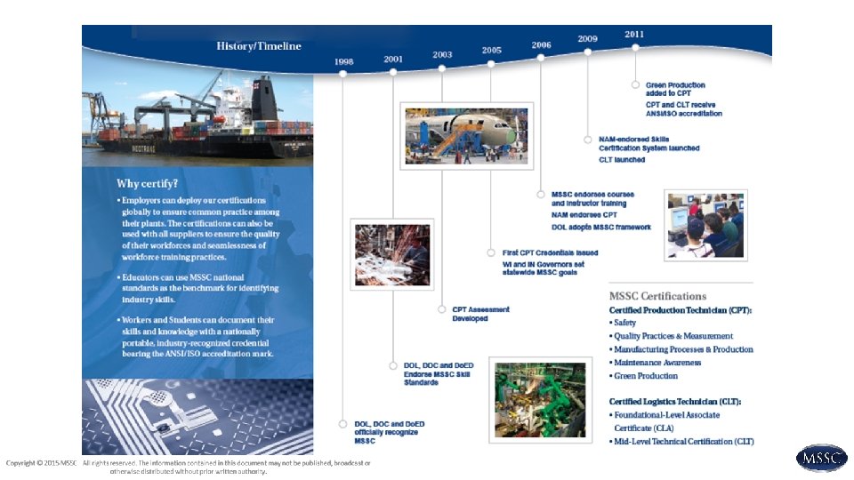 The MSSC Solution Click Link for MSSC Web. Site Preparing the agile worker or “industrial athlete of the future” § Nationwide certification for high performance production technician § Modern foundational skills: o Broad-based technology o Workplace behavior o Problem-solving o Lean manufacturing o Teams o Adaptable to rapid change