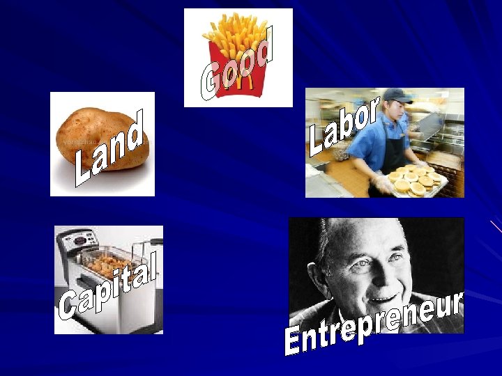 Factors of Production Land (natural resources) – Found in nature…oil, water, coal, trees Labor (human resources) – Effort that a person devotes to a task Capital (human-made resources used to make a g/s) – Physical Capital – buildings, tools, machinery – Human Capital – skills, education, etc. Entrepreneurship – risk-takers who combine resources to create g/s