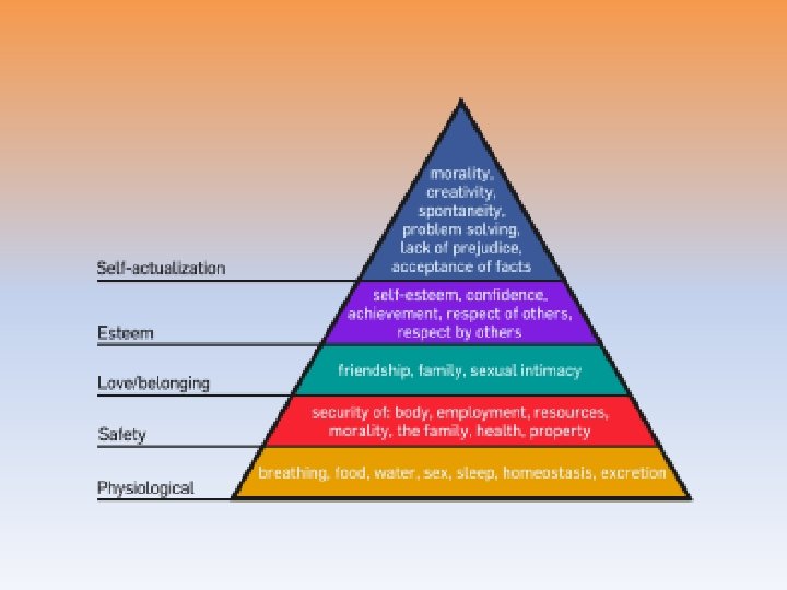 Our capacity to choose our life patterns and not just be driven by unconscious forces or shaped by the environment ●A reaction to behaviorism and psychoanalysis ●How we seek maturity and fulfillment ●How people experience and understand their own lives ●How people find meaning in life ●Maslow’s Hierarchy of needs ● Perspective: Humanistic ● Treatment?