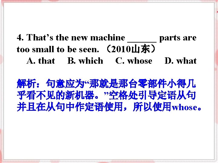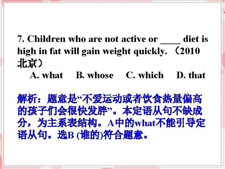 6. I refuse to accept the blame for something _______ was someone else’s fault. (2010 全国Ⅱ) A. who B. that C. as D. what 解析:不定代词something作主语,用that引 导。